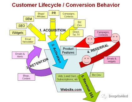 AARRR(获取 Acquisition,激活 Activation,留存 Retention,推荐 Referral,收益 Revenue )是一个客户生命周期框架。