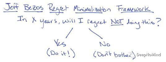 “遗憾最小化框架”通过设想未来的自己,回顾当前的决定,帮助你做出艰难的决定。RMF 将帮助你下决心放弃当前的工作,并尝试去创建那些一直在你心里的东西。