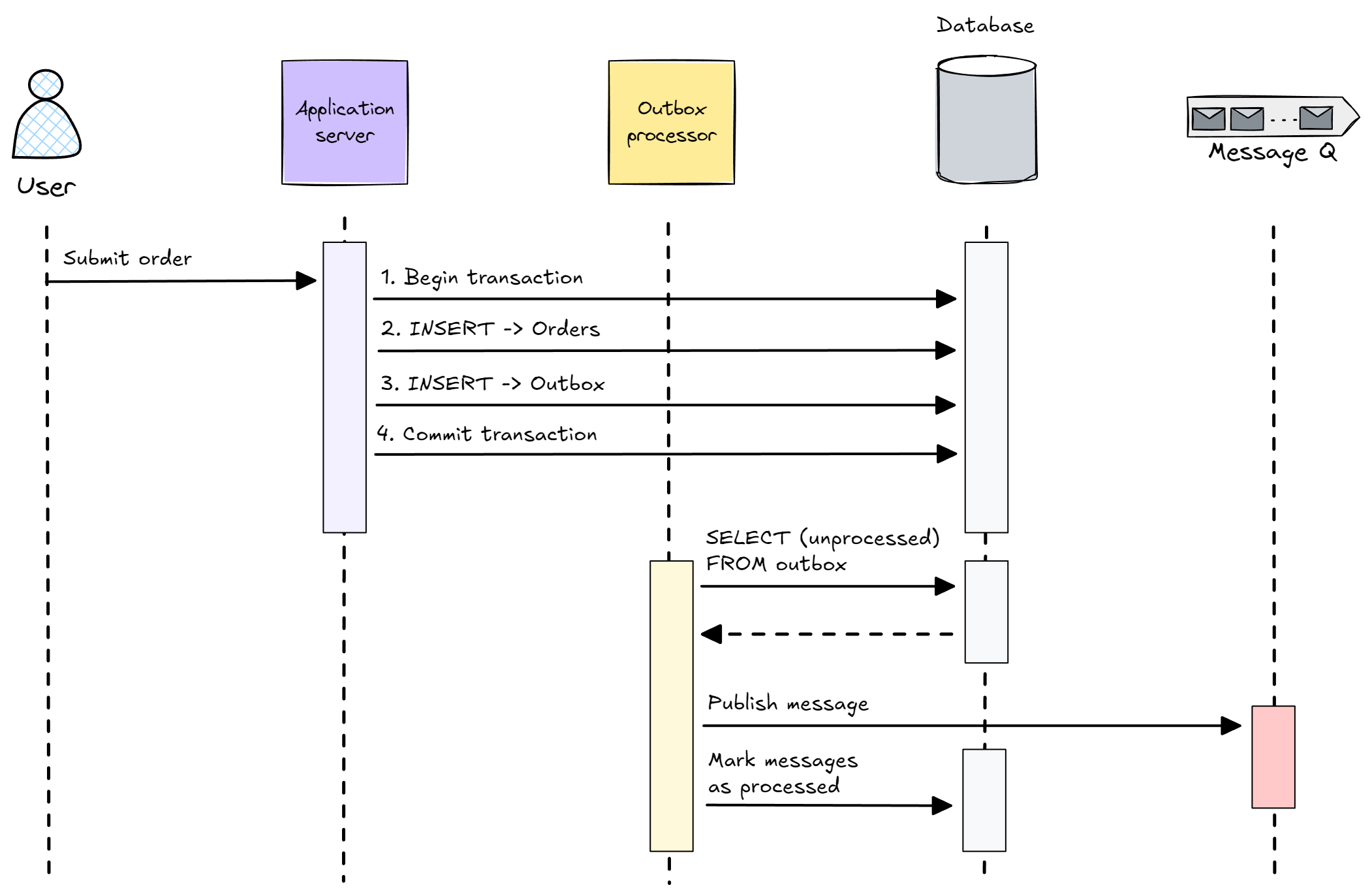 如果其中某个步骤失败,系统可能最终处于不一致状态。也许订单被保存了,但是没有其他人知道。或者每个人都认为有新订单,但数据库里却没有。