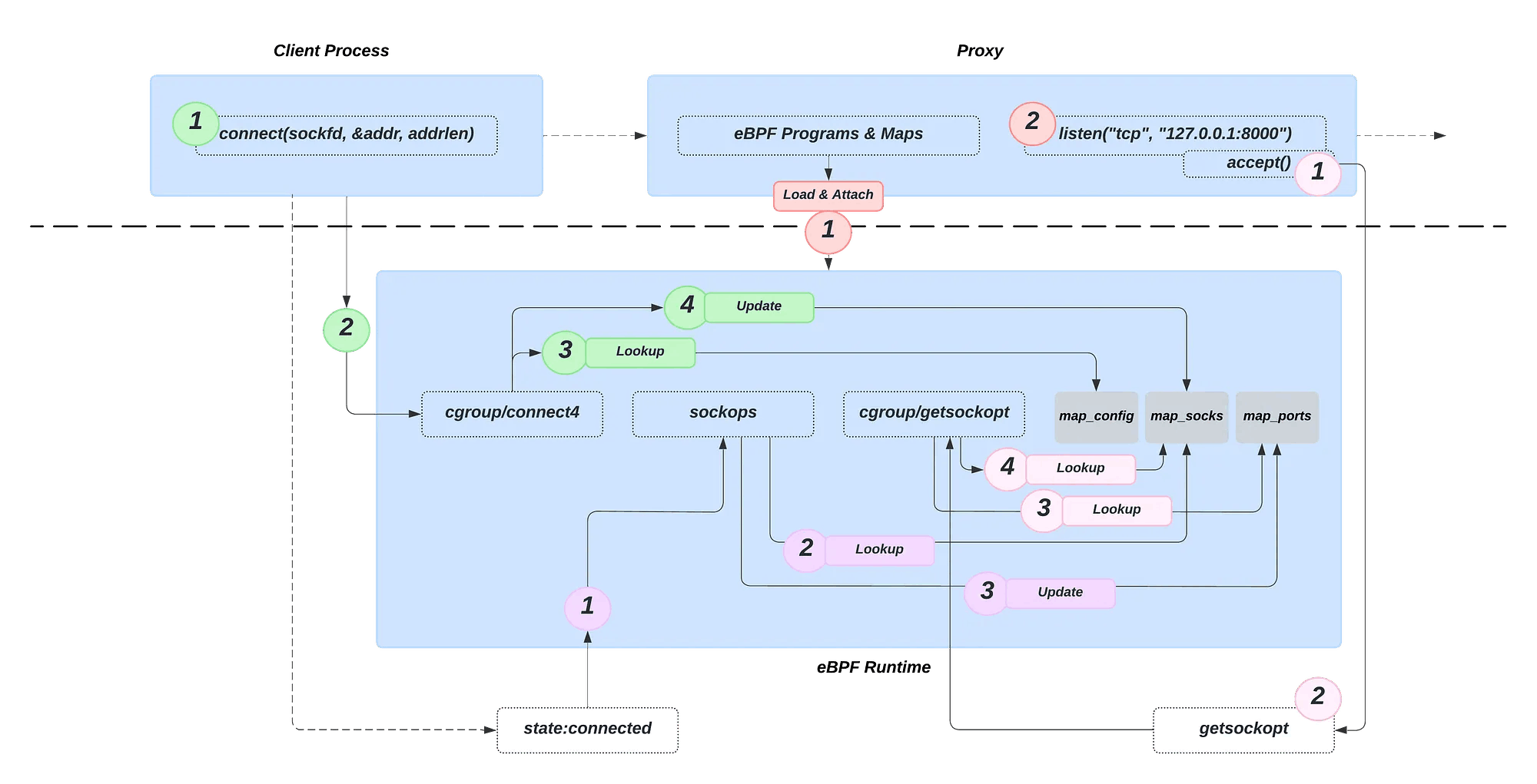 用 eBPF 实现透明代理涉及三个 eBPF 程序,每个程序负责网络拦截和转发的不同功能: