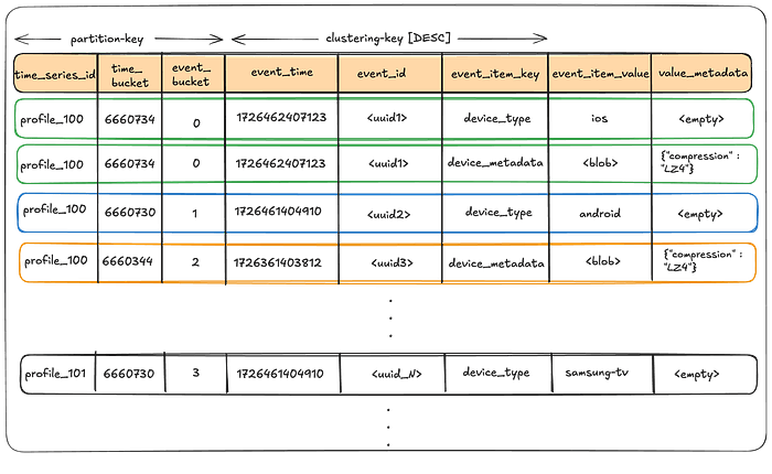 事件桶(Event Buckets):为了管理极高的写入操作(这些操作可能会导致在较短时间内针对某一时间序列出现大量写入操作),我们进一步将时间桶划分为事件桶,从而避免在给定的时间范围内对同一分区进行过度加载,并且还能进一步减小分区大小,缺点是会带来轻微的读取放大效应。