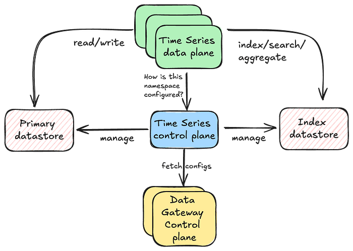 数据面负责执行读取、写入操作,而控制面则配置命名空间行为的各个方面。数据面与时间序列控制栈进行通信,该栈负责管理配置信息。反过来,时间序列控制栈与共享的数据网关平台控制面进行交互,后者负责监督所有抽象以及命名空间的控制配置。