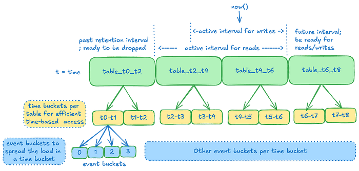 在单个事件上使用时间戳(TTL)会在 Cassandra 中生成大量墓碑(tombstones)记录,从而降低性能,尤其是在进行基于范围的扫描时。通过采用离散时间切片并将其删除,完全避免了这种问题。但代价是数据可能会比实际所需的保留时间稍长一些,因为整个表的时间范围必须完全超出保留窗口之外才能被删除。此外,TTL 很难在之后进行调整,而时间序列则可以通过单个控制平面操作立即扩展数据集的保留期限。