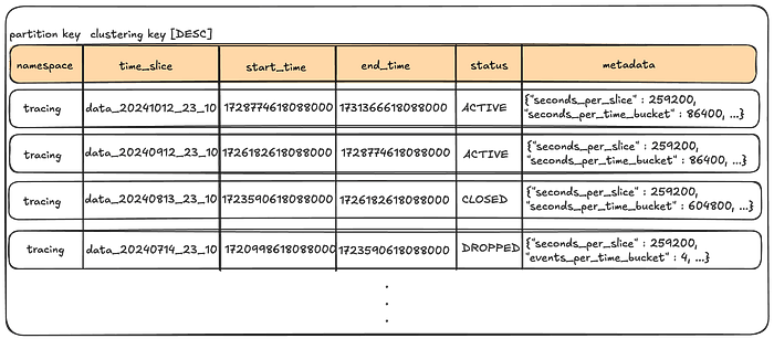 时间切片(Time Slice):时间切片是保留数据的单位,直接映射到 Cassandra 表。我们创建多个这样的时间切片,每个切片覆盖一个特定的时间间隔。事件根据 event_time 落在其中一个切片中。切片无缝连接在一起,操作包括开始时间但不包含结束时间,确保所有数据都位于其中一个片中。