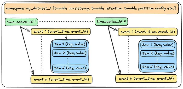 • 命名空间(Namespace):命名空间是一个时间序列 ID 和事件数据的集合,代表完整的时间序列数据集。用户可以为每个用例创建一个或多个命名空间。这种抽象在命名空间级别应用了各种可配置选项,我们将在探讨服务的控制平面时进一步讨论这些选项。
