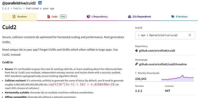 NPM:https://www.npmjs.com/package/@paralleldrive/cuid2
