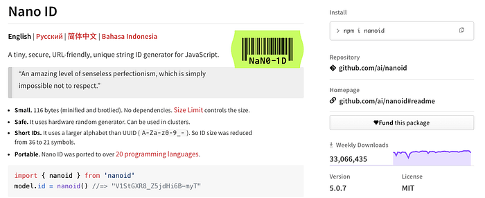 NPM:https://www.npmjs.com/package/nanoid